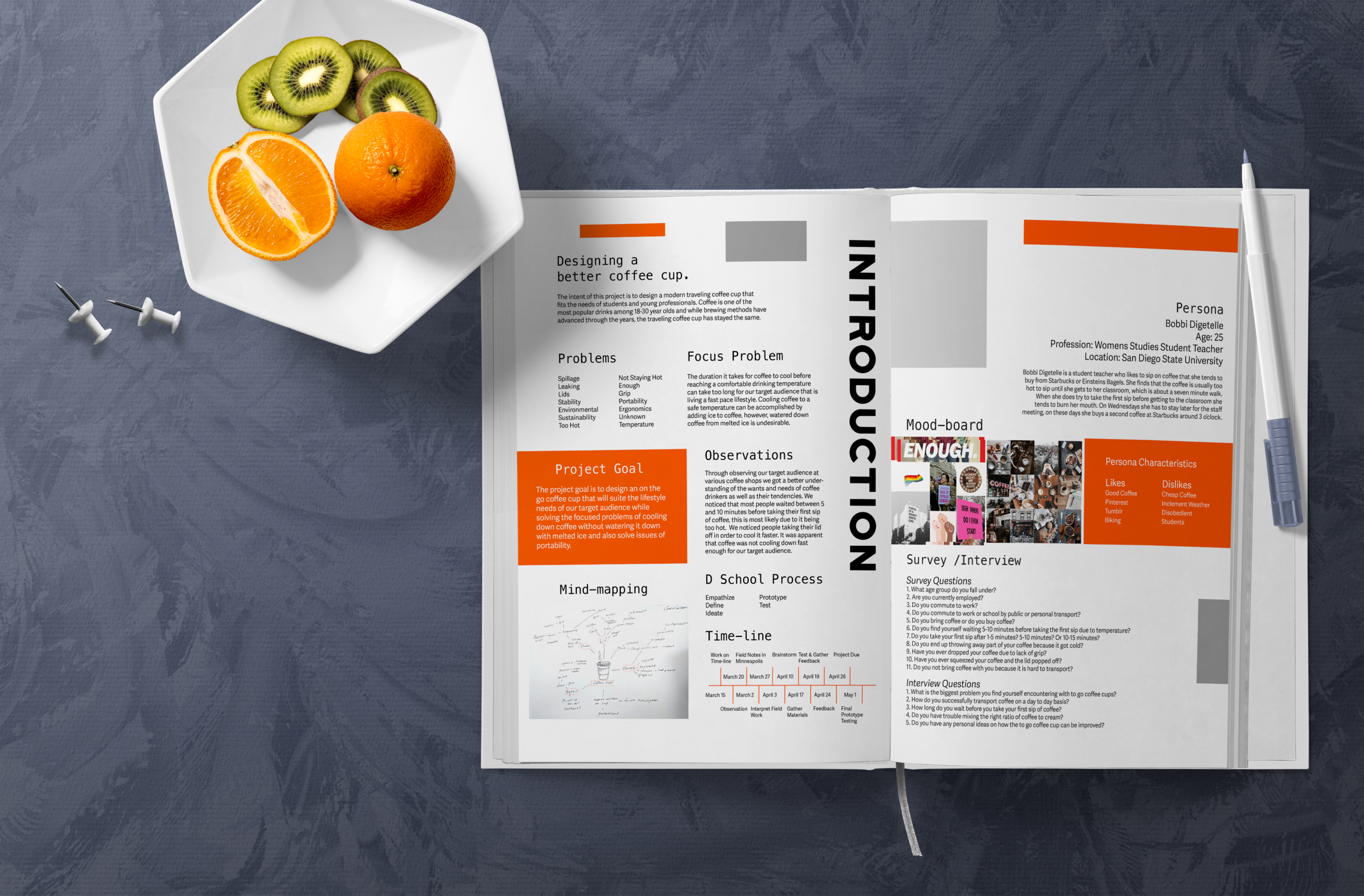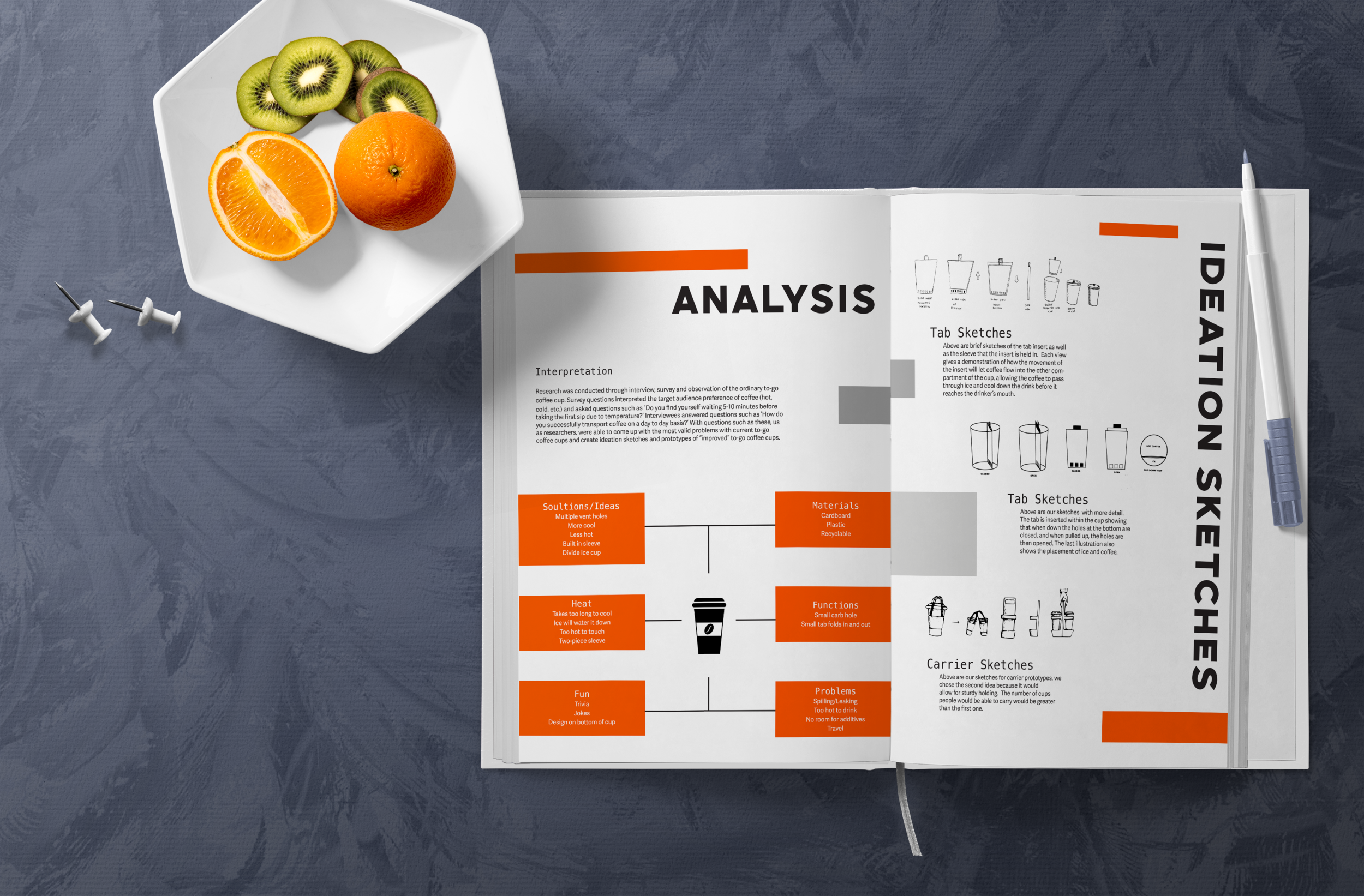 Research was conducted through interview, survey, and observation of the ordinary to-go coffee cup. Survey questions interpreted the target audience preference of coffee (hot, cold, etc.) and asked questions such as ’Do you find yourself waiting 5-10 minutes before taking the first sip due to temperature?’ Interviewees answered questions such as ‘How do you successfully transport coffee on a day to day basis?’ With questions such as these, us as researchers, were able to come up with the most valid problems with current to-go coffee cups and create ideation sketches and prototypes of “improved” to-go coffee cups.