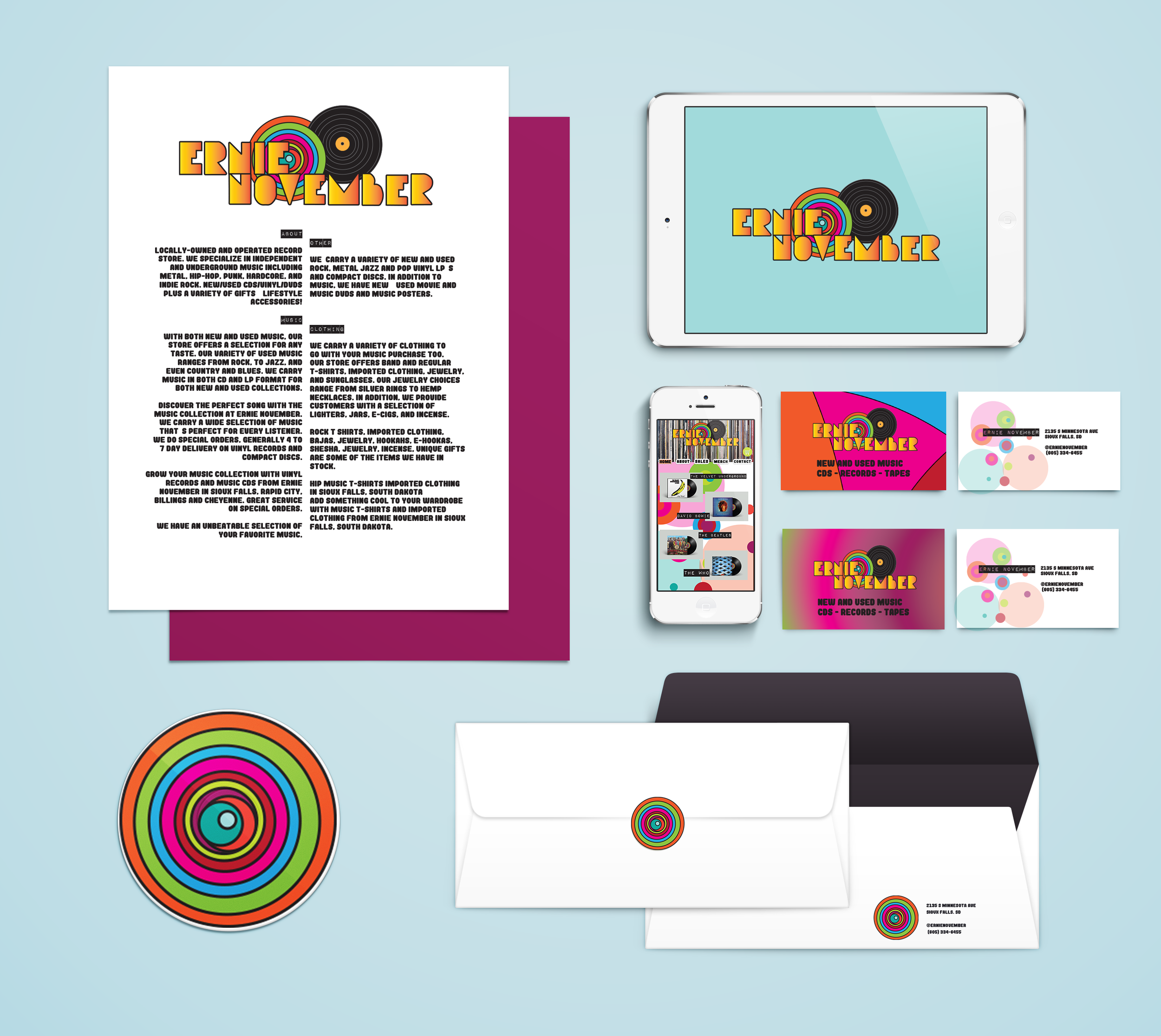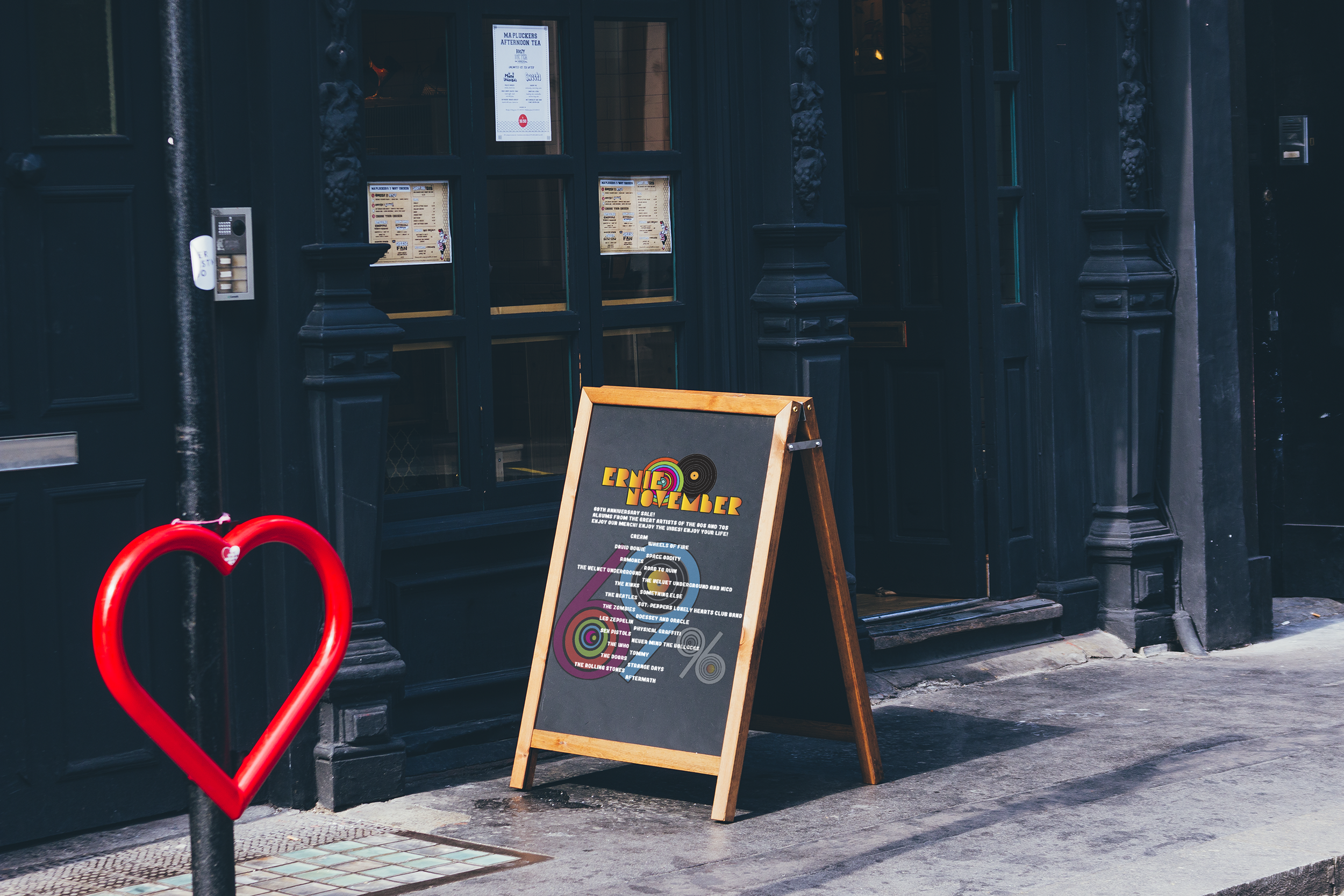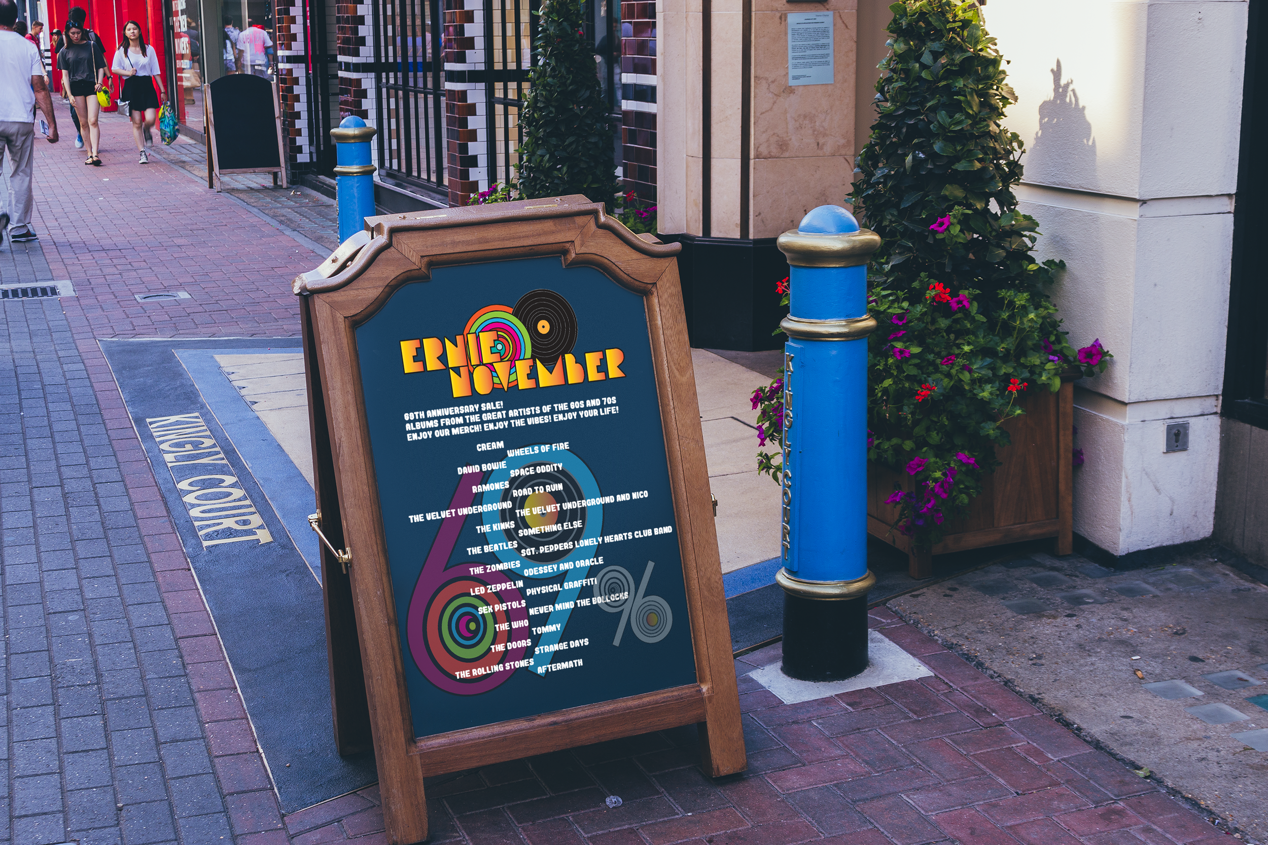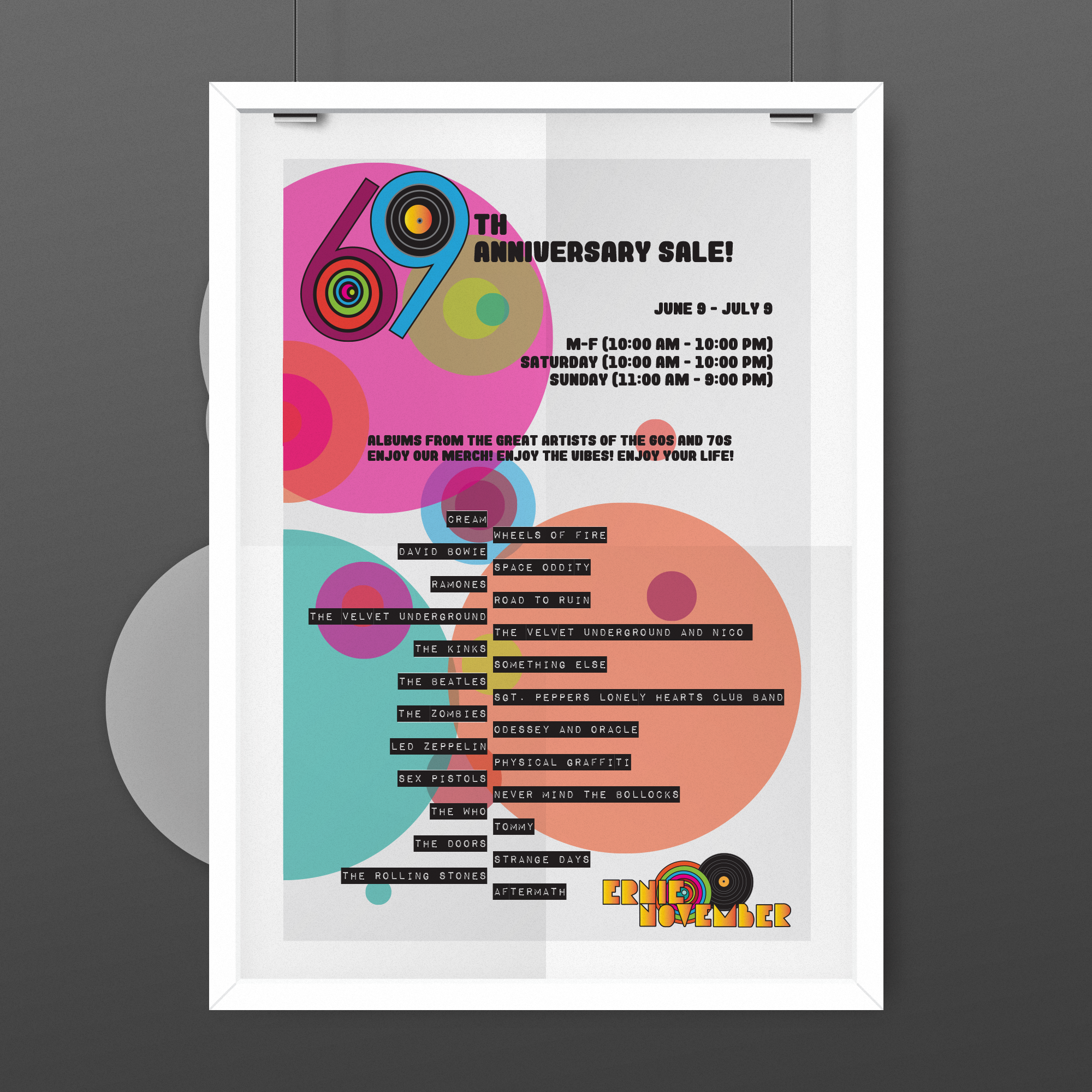 The objective for this project was to create posters, stationery, social media, and merchandise to help promote the 69th anniversary and the identity of Ernie November. Signage was to be used to promote the event. This anniversary would bring attention to musicians from the 60s and 70s and keep vinyl alive. There were two official designs for the vinyls that would be sold as the special, as well as the music from those years would be 69% off.