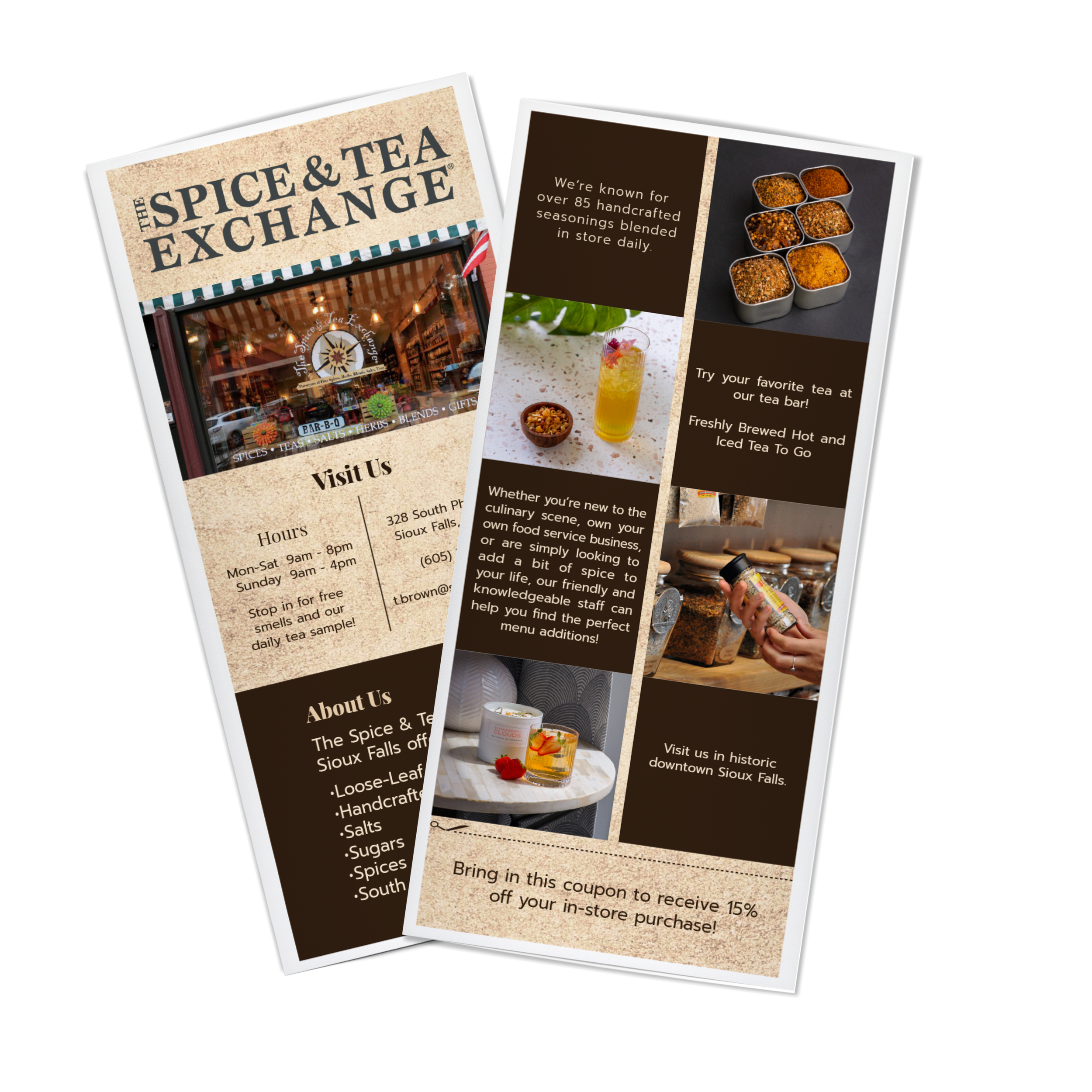 I was tasked with the project of working on a design for a rack card that would be distributed to the visitor center at Falls Park in Sioux Falls, SD. The back has a coupon for customers to receive 15% off when returned to the store.